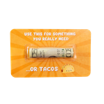 Your purchase includes a clear plastic dome for rolled bills, and an adhesive sticker perfectly sized to the dome. Pictures show the intended use but NO MONEY IS INCLUDED.